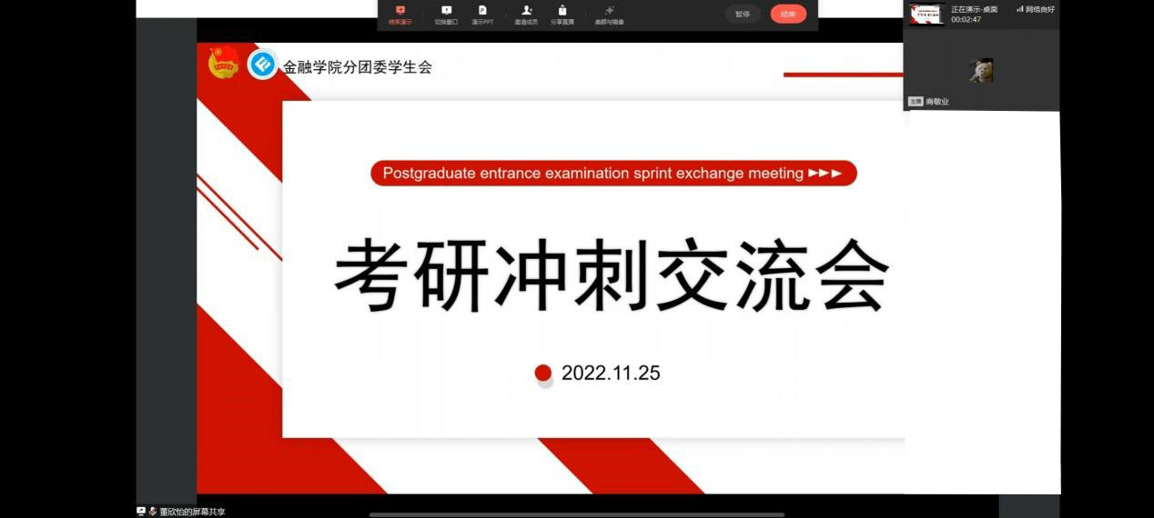 距2023年全国硕士研究生招生考试仅剩一个月,为给2023届考研学子加油鼓劲,助力考研学子坚定信心、调整状态、科学合理安排冲刺阶段的备考,11月25日19:30,jinnianhui今年会在企业微信线上举办考研冲刺交流会。jinnianhui今年会党委书记、副院长石世明,jinnianhui今年会党委副书记、纪委书记余新参加了会议。同时邀请2022届考研成功的优秀校友为同学们分享经验,鼓舞信心。