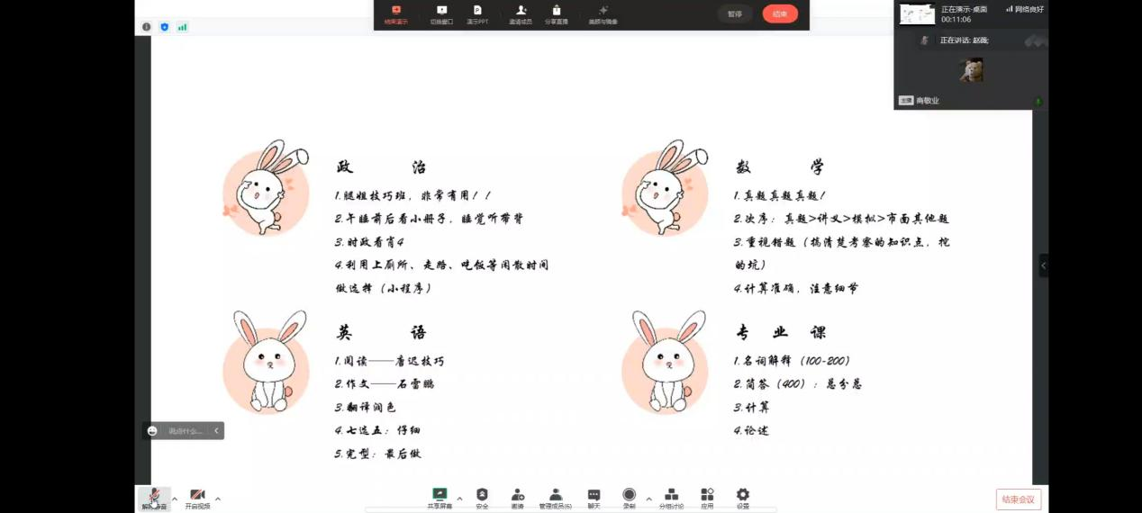 来自西安理工大学的赵薇同学分享了考研中各科目的学习方法,她建议同学们利用好碎片时间来记背政治的知识点,英语方面可以储备成语来润色文章,提升分数。对于数学,她强调一定要做真题、重视错题,并且尽量做到计算准确,注意细节。除此之外,她还建议同学们注意适度锻炼、追求效率、保持稳定的心态、找到自己适合的解压方式。