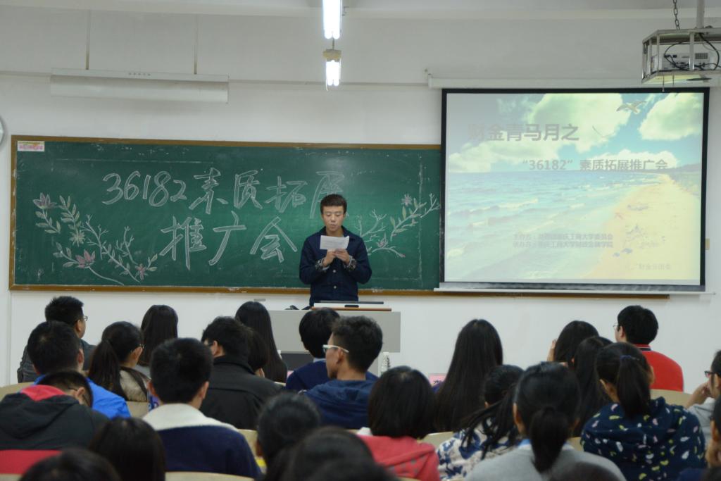 2015年11月5日,财政jinnianhui今年会分团委学生会组织开展了“36182”素质拓展工程推广会,对15级CFA新生进行素质拓展的全面讲解,并邀请了校学生会素拓部部长徐义配,财金学院学生会副主席李超,素拓部部长参加本次素拓推广会。
