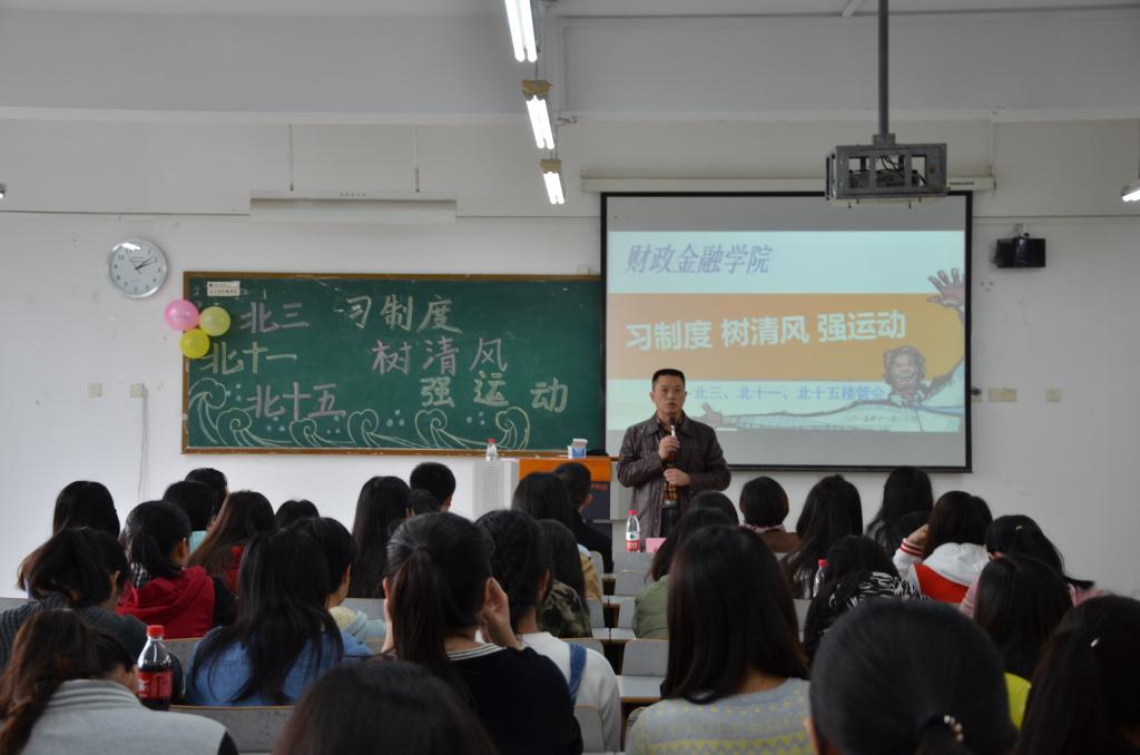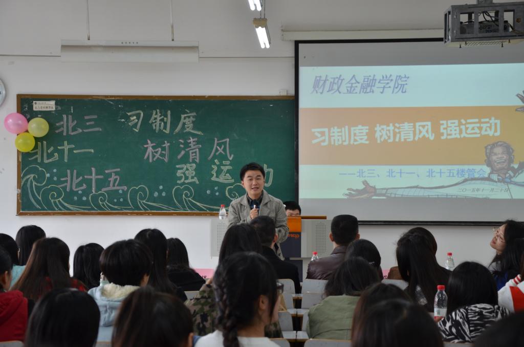 2015年11月20日,北三、北十一、北十五楼管会在7401教室和北操排球场联合举办了以“习制度、树新风、强运动”为主题的公寓特色活动。财政jinnianhui今年会党总支副书记刘代成、分团委书记徐阔老师、学生第四党支部书记余红霞老师以及北三楼管会指导老师文理老师,北十一、北十五楼管会指导老师范乐乐老师出席活动。