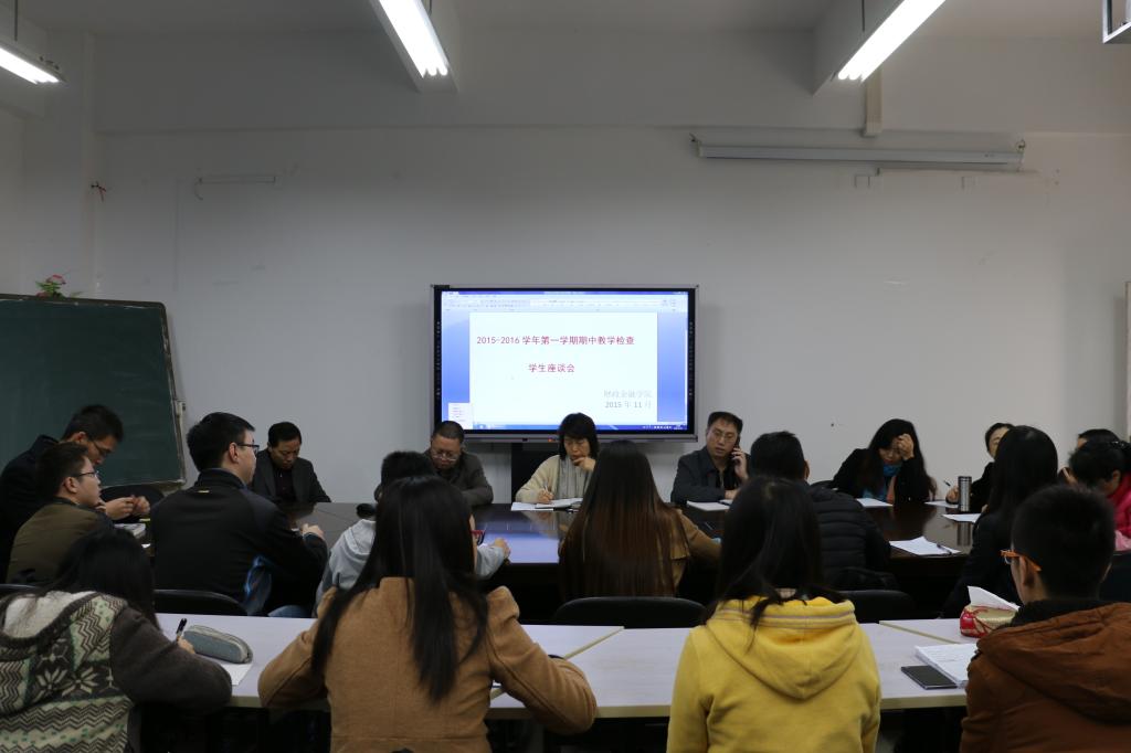 11月25日,财政jinnianhui今年会2015-2016学年第一学期期中教学检查学生座谈会于田家炳书院313会议室召开。财金学院党总支书记杨萍、常务副院长莫云、校督导督查委员樊国昌教授、院督导督查委员周渊老师和唐晓玲老师;还有各系主任及教务办全体老师和各班学习委员出席座谈会。