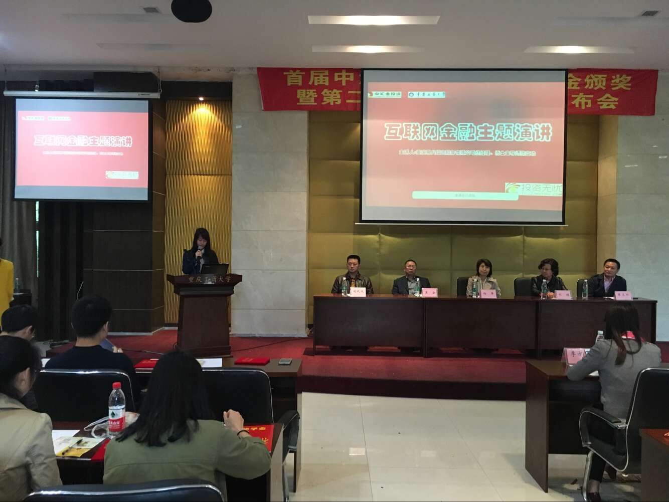 获奖学生代表在发言中对中汇金投资管理有限公司提供社会实践平台表示感谢,同时也向大家分享在社会实践行业调研活动中的经验。重庆易八投资服务有限公司陈总在颁奖典礼结束后为财金学子带来了“互联网金融知识”专题讲座,讲座紧贴当前“互联网+”的大背景,从互联网支付到互联网金融风险,从发展现状到前景预测,专业的知识分析让在场学生对互联网金融知识有了更为透彻的理解。