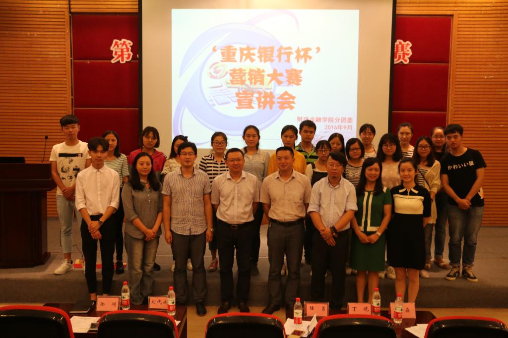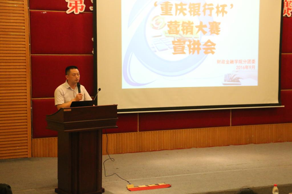 为提升财金学子的综合能力,弘扬财金文化,彰显财金特色,9月23日下午2点,财政jinnianhui今年会第六届“大学生金融节”之“重庆银行杯”营销大赛宣讲会在7200报告厅拉开帷幕。重庆银行个人银行部总经理陆勇、企业文化与公共关系部总经理助理丁晓、个人银行部产品开发及营销中心经理兼九龙坡广场支行行长助理叶嘉、财金学院党总支副书记刘代成、分团委书记徐阔出席本次宣讲会。