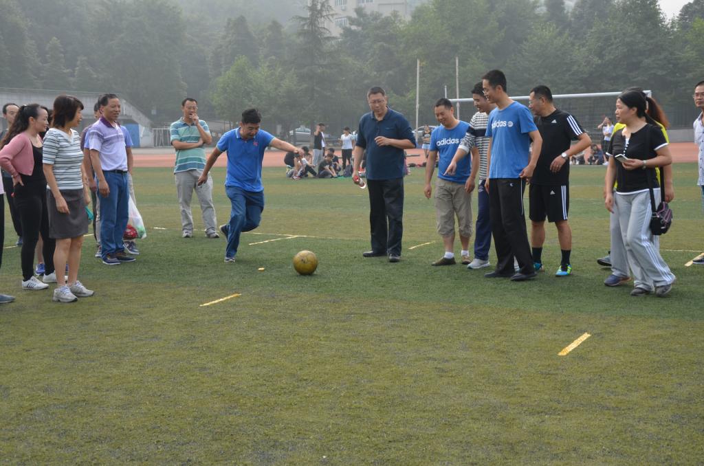 本届运动会共设置了五个项目,分别是6*60迎面接力、定点足球射门、四人五足、跳大绳、颠球+踢毽子。首先进行的是6*60迎面接力项目,各代表队分别派出男女教师各3人,最终成绩由所花时间少者获胜。各代表队为了获得好成绩,都派出了本队的精兵强将,参加校运动会的短跑健将们都参与其中,其他老师则当起了啦啦队,使劲地给本队加油助威,最终本项目的冠军被金融代表队获得。