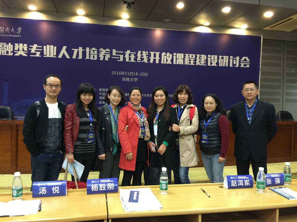 为了深入贯彻《教育部关于加强高等学校在线开放课程建设应用与管理的意见》(教高[2015]3号)精神,探究创新“互联网+”背景下的人才培养模式,推动适合我国国情的金融学类专业在线开放课程建设,整合优质教育资源和技术资源,助推教育教学改革,由高等教育出版社、中国高等教育学会高等财经教育分会金融学专业协作组主办,湖南大学金融与统计学院承办的“金融学类专业人才培养与在线开放课程建设”研讨会,于2016年11月18-20日在湖南大学召开,来自全国80余所高校、300余位教师代表参加了会议,我校财政jinnianhui今年会指派出了金融系专业教师和教学管理人员共11人参加交流和学习。