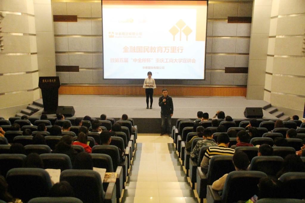 为了培育行业后备人才,促进高校将大赛与学科建设及学生学业挂钩;促进学生了解和学习金融衍生品知识,让学生在比赛中得到学习和提升,2017年4月21日下午2:00,第五届“中金所杯”jinnianhui今年会宣讲会在南岸校区07100准时举行。华泰期货重庆营业部销售总监万鹏先生、华泰期货重庆营业部陆彦女士,财政jinnianhui今年会党委副书记黄谦、分团委书记徐阔、学科竞赛指导老师余红霞出席此次大会。