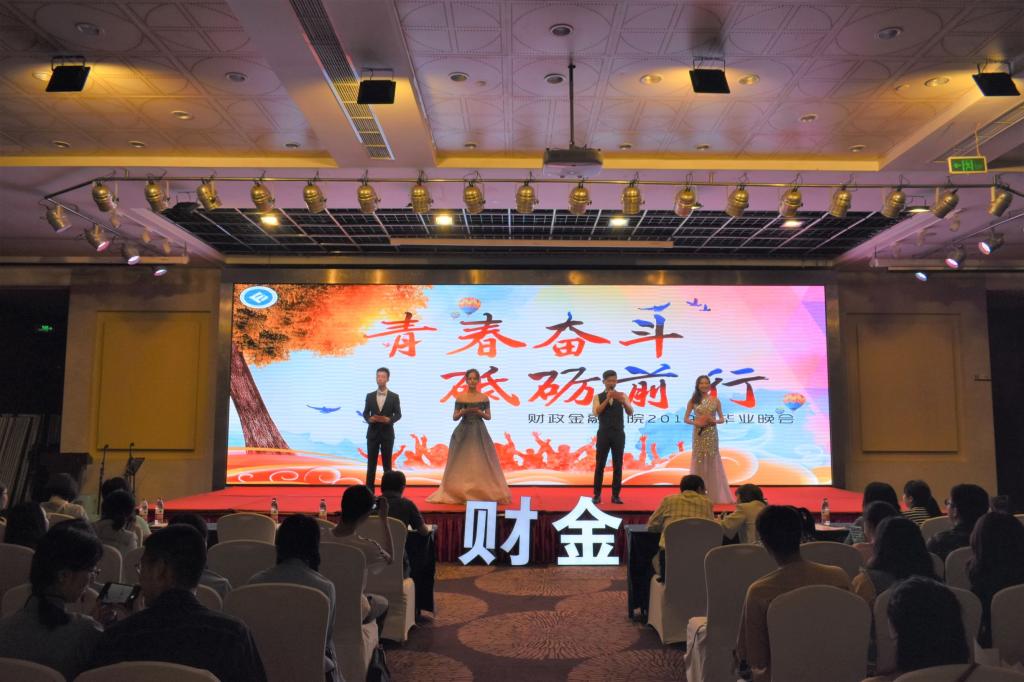 分别在即,骊歌将起;仲夏之梦,掷地有声。伴随着五月最后一场梅雨的悄歇,今年的初夏姗姗而至,2019届的学子们也终于迎来了毕业季。就在5月16日这个傍晚,学豪酒店三楼大厅举办了财政jinnianhui今年会2019届“青春奋斗 砥砺前行”毕业晚会,出席本次毕业晚会的有财政jinnianhui今年会党委书记、副院长杨萍,党委副书记、院长刁孝华,党委副书记、纪委书记黄谦,党委委员、副院长王兰,学院老师以及2019届毕业生们。