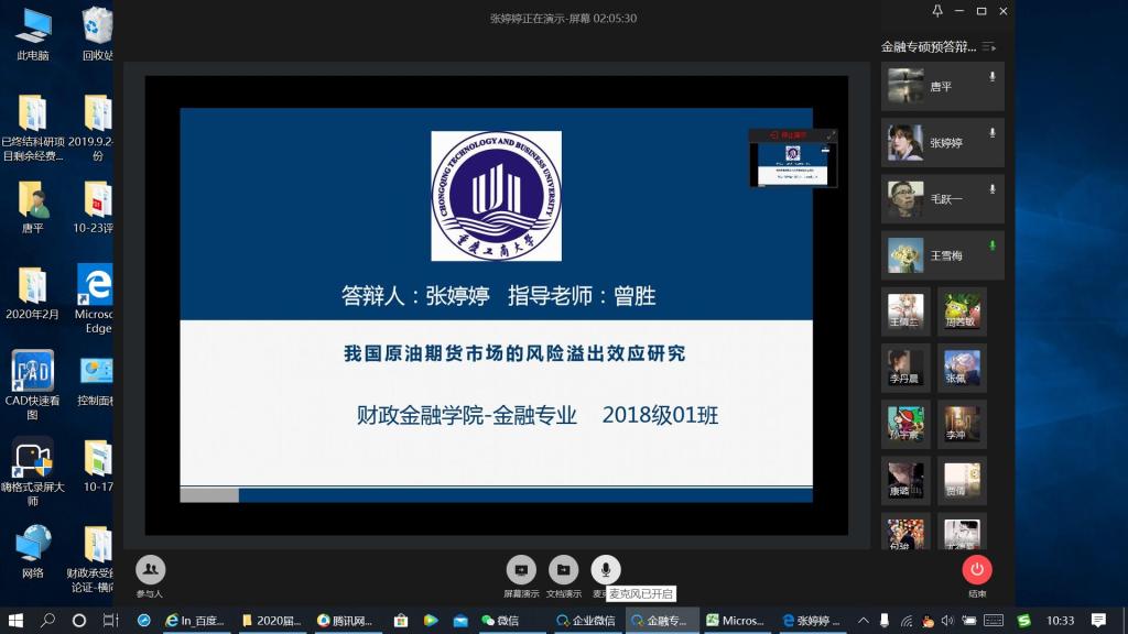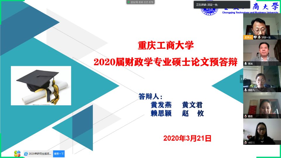 为提高研究生学位论文质量,完成研究生学位论文工作,2020年3月21日,财政jinnianhui今年会对2017级金融学和财政学学硕、2018级金融专硕以及2018级拟提前毕业的金融学硕,共85名硕士生的学位论文进行了在线预答辩。