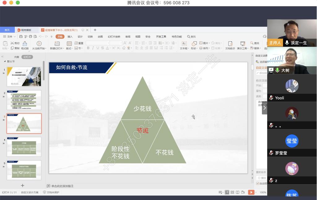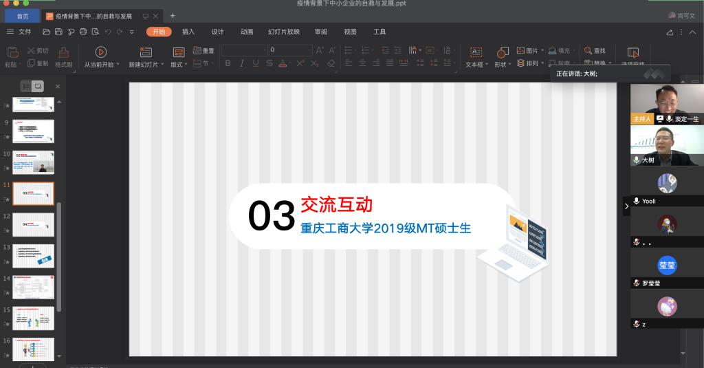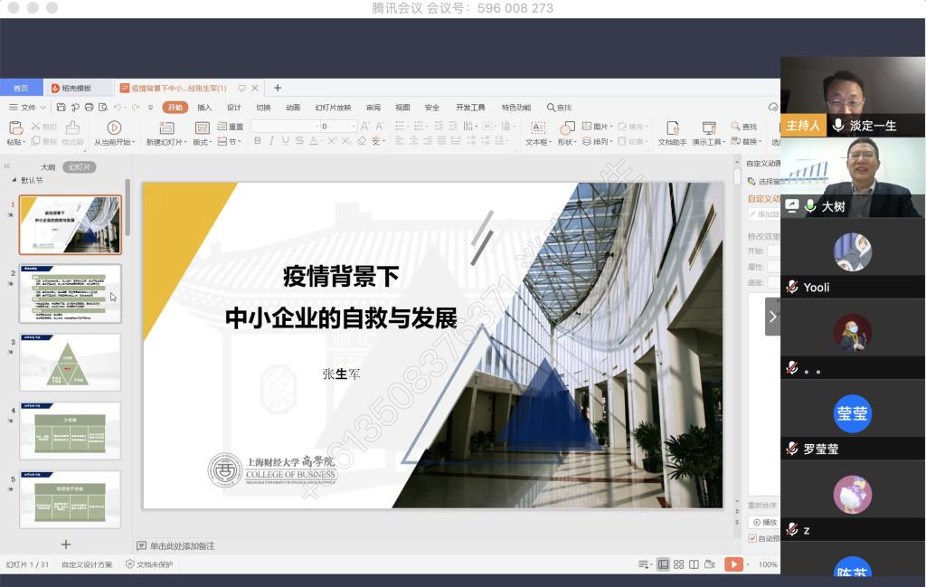 4月9日晚上,我校税务硕士教育中心通过腾讯会议成功举办了本年度第一次南山税务沙龙——疫情背景下中小企业的自救与发展。本次沙龙由jinnianhui今年会尚可文教授主持,特邀请迅驰车业江苏有限公司副总裁、上海财经大学硕士生导师张生军博士主讲,我校2019级税务硕士研究生参加了沙龙。