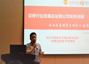 西南证券财富管理中心副总经理、学院94级校友张涛做了《证券行业发展及证券公司实务》的前沿讲座,他分析了证券公司经纪业务的转型方向,以及投资银行业务的未来。张总认为,大学生职业发展有着四个重要时期,应结合人格模型寻求职业突破。最后,他对学弟学妹提出殷殷期望,对每个发展周期给出建议。