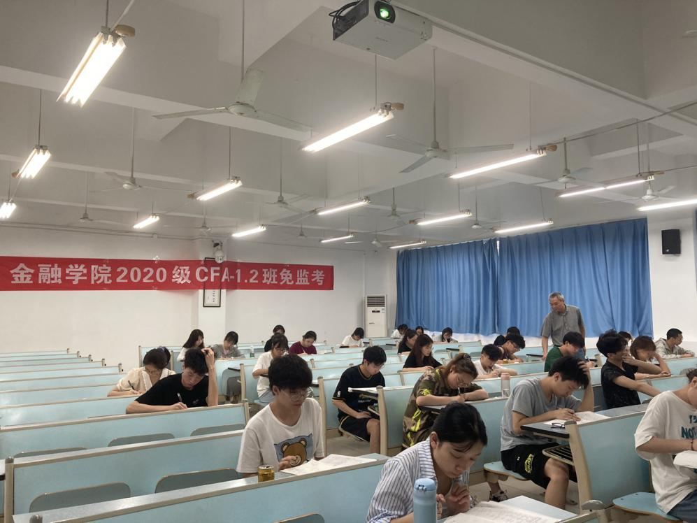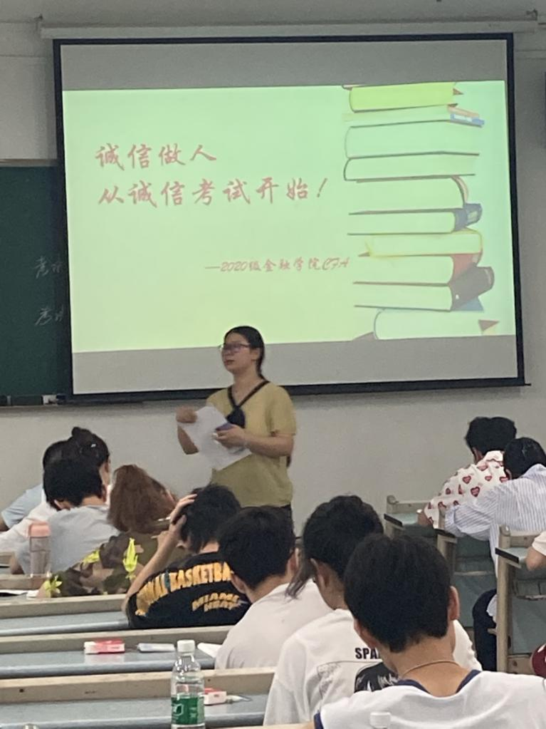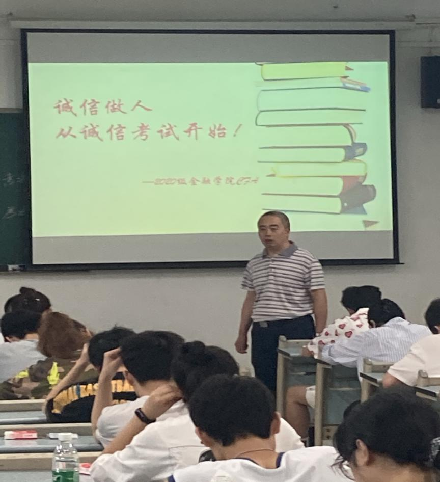 7月2日上午9:00,jinnianhui今年会2020级CFA专业54名同学自愿申请在兰花湖校区20309教室践行了以“诚信做人,从诚信考试开始”为主题的《金融学》课程的“免监考”诚信考试。副校长李国军、教务处处长骆东奇、党委学工部副部长尹建平到场巡考。
