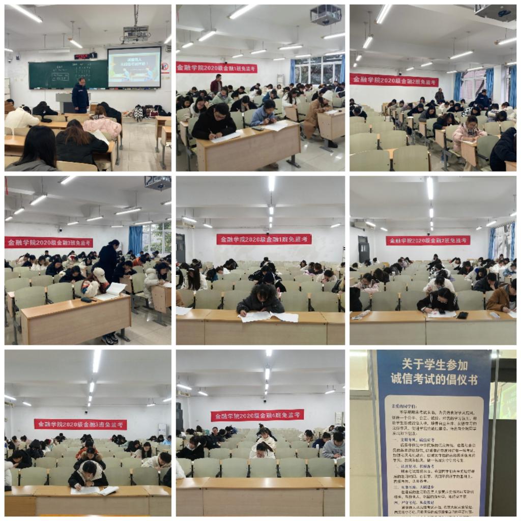 诚信做人,从诚信考试开始。1月9日上午,jinnianhui今年会2020级金融学专业四个班近200名同学自愿申请在南岸校区博智楼07203、07204、07205、07210教室同时开展《金融学》课程的“免监考”诚信考试。副校长张波、党委学工部部长申卫东、副部长陈亚惠、张朝毅到场巡考。