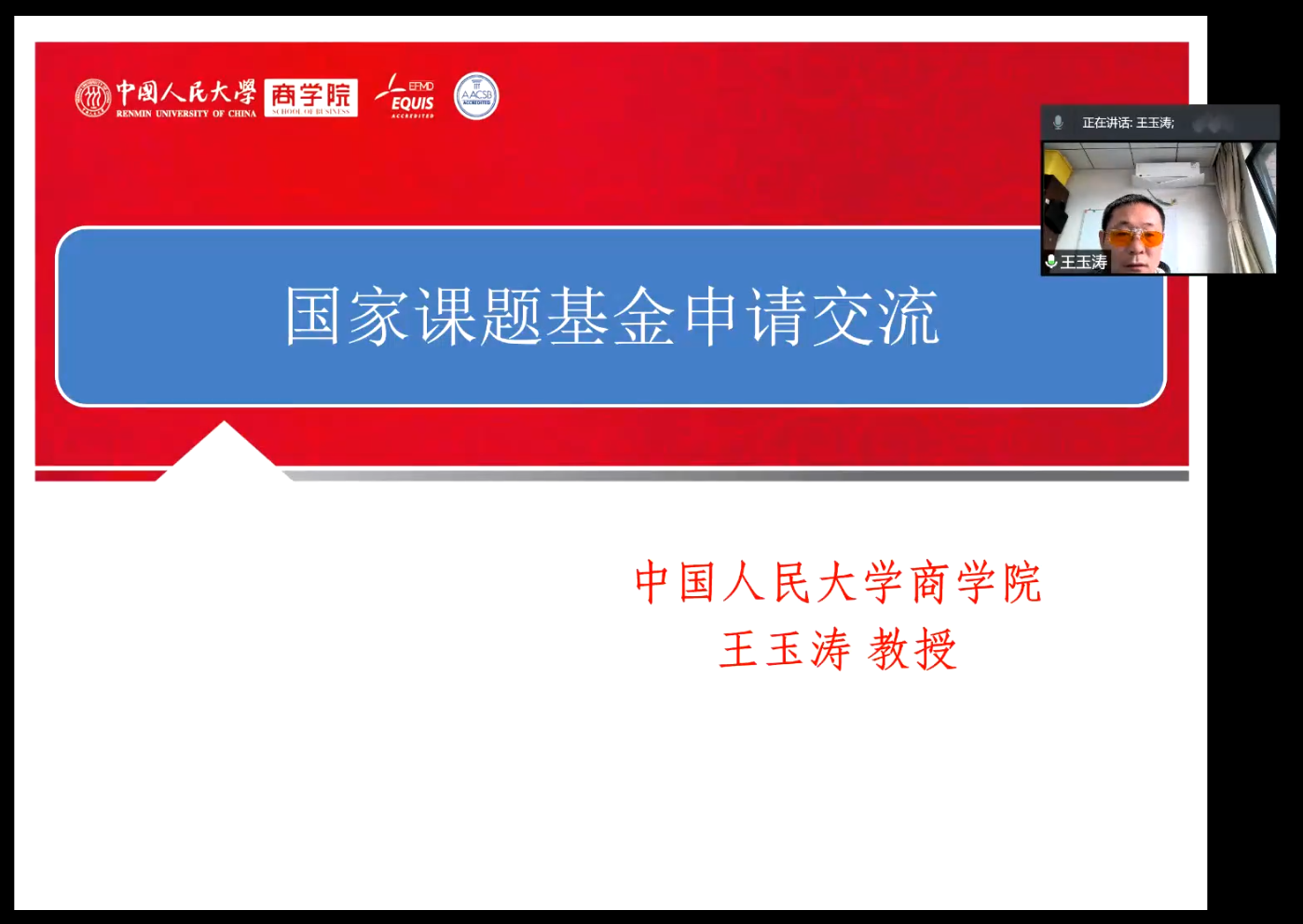 为推动2022年度国家社科基金项目申报工作的顺利进行,进一步提高项目申报质量,根据工作安排,2022年2月12日,jinnianhui今年会举行2022年度国家社科基金项目线上专家论证会,中国人民大学商学院王玉涛教授受邀到会指导,学院拟参与2022年国家社科基金项目申报的20余名教师参加了论证会。会议由副院长王韧主持。
