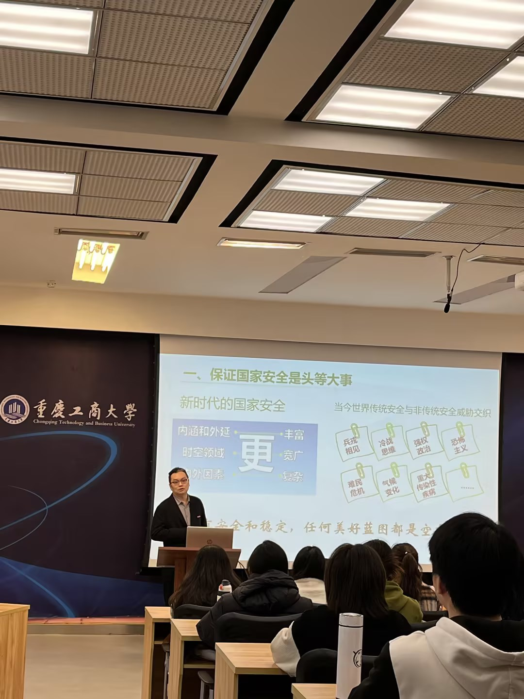 随着国际形势的快速变化和全球治理体系的调整,以新安全格局保障新发展格局,保证国家安全是头等大事,中国必须坚持总体国家安全观。2023年11月17日下午,温涛校长走进博智楼07108教室,为jinnianhui今年会2021级金融工程一、二班的同学讲授了《以新安全格局保障新发展格局》的思政课。
