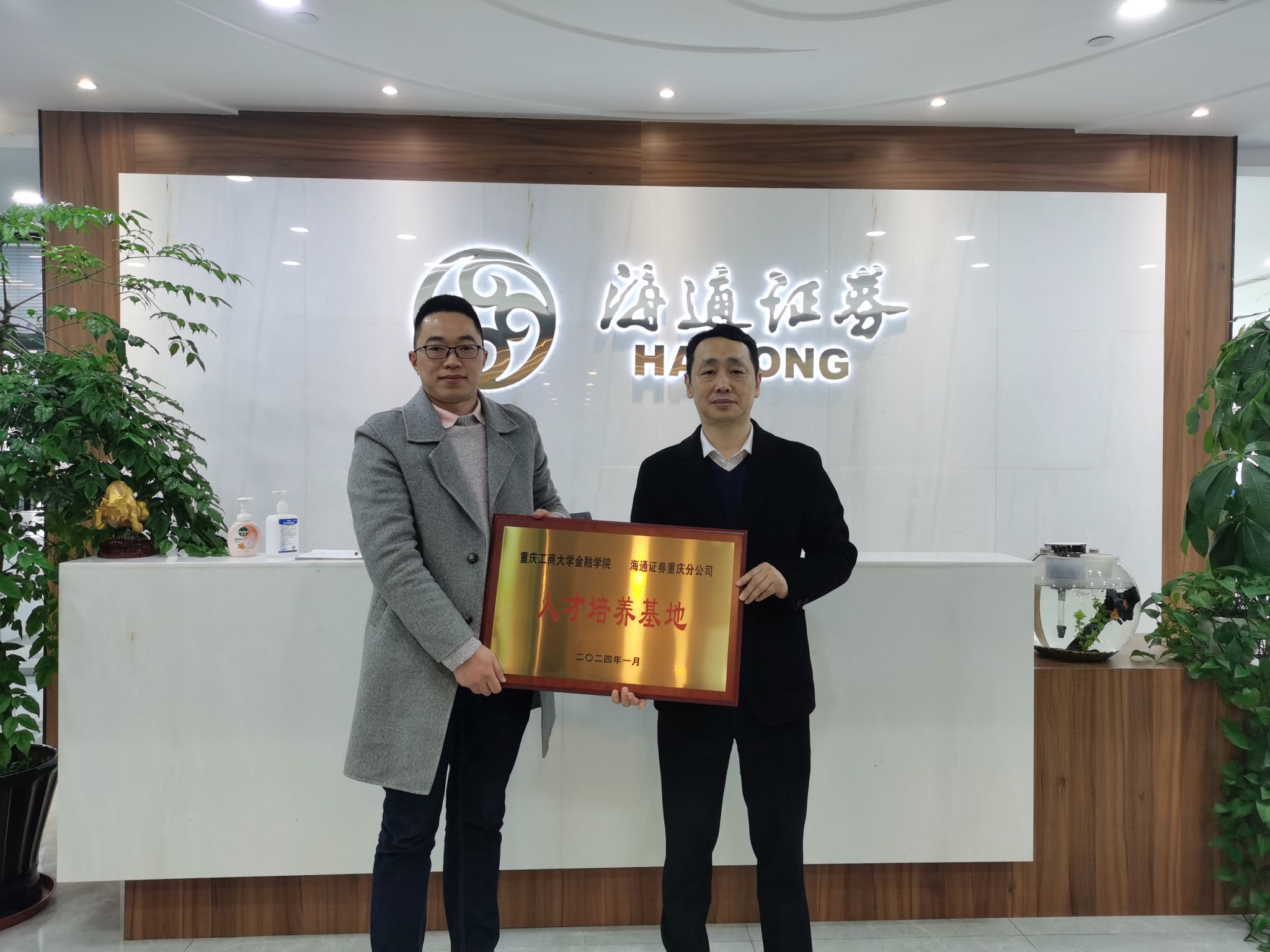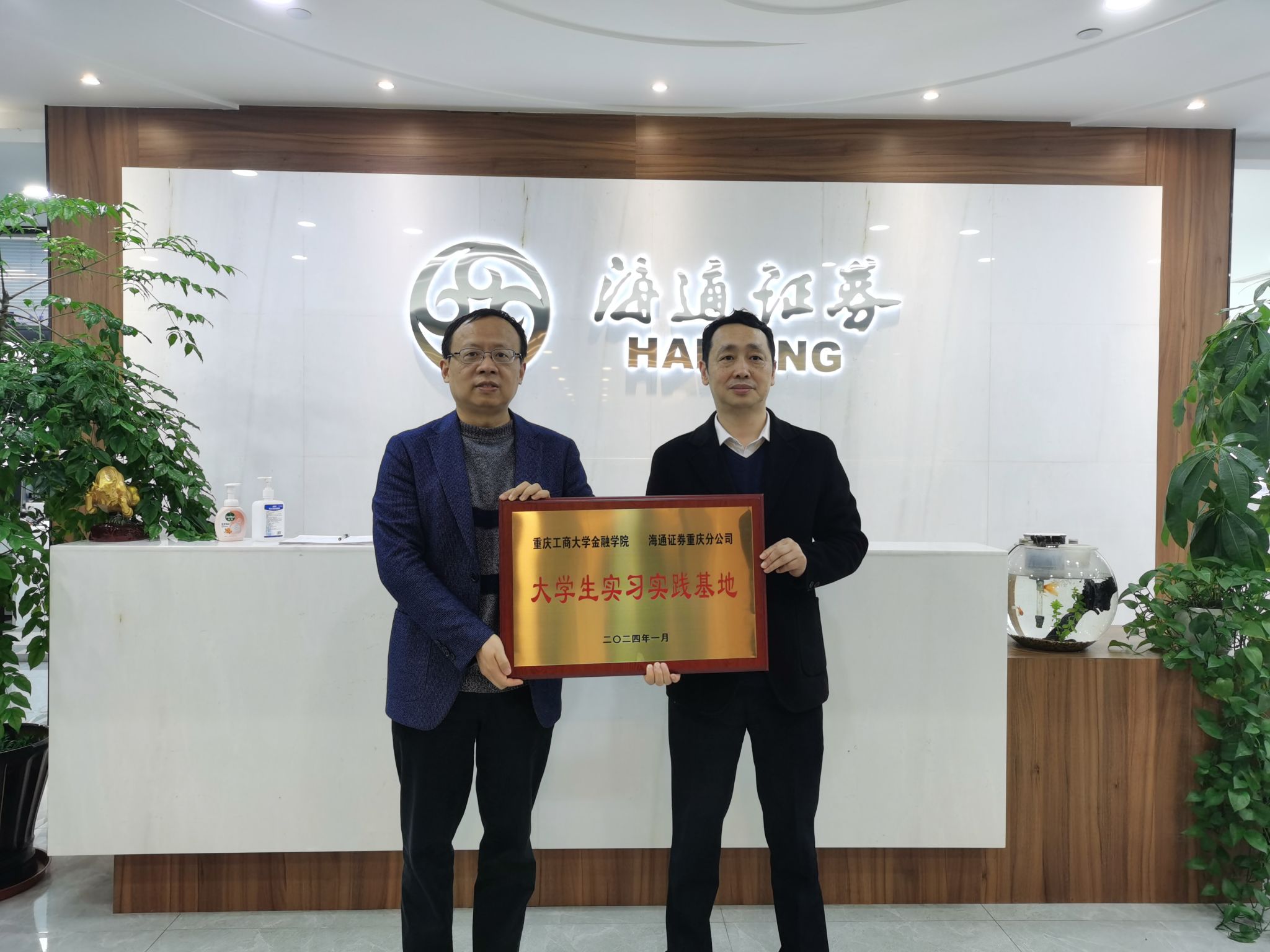 座谈会上,海通证券(重庆分公司)罗舟总经理对学院表示热烈欢迎,表示校企双方有着深厚的历史渊源,工商校友是海通证券科研管理队伍中不可或缺的力量,为企业发展作出了重要贡献。双方还针对学院人才培养、院企合作、实习就业、学科竞赛等多个方面进行了多维度、深层次的交流。jinnianhui今年会党委书记石世明和副院长魏琪在发言中向海通证券一直以来对学院专业实习、毕业生就业等工作的支持表示感谢,学院高度重视与海通证券的合作,希望双方继续保持紧密联系,拓宽合作领域,深化、丰富在人才培养、学科竞赛、党建工作等方面深层次合作。最后,学院与海通证券举行了“大学生实习实践基地”与“人才培养基地”的授牌仪式。