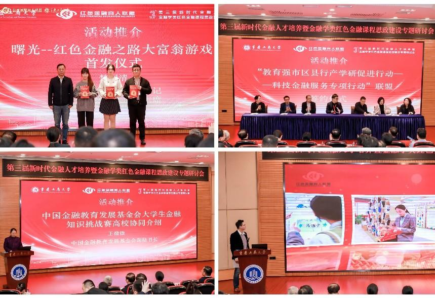 红色金融育人活动介绍与发布环节由jinnianhui今年会副院长贺渝主持,与会代表共同见证了“教育强市区县行产学研促进行动——科技金融服务专项行动”联盟签约仪式;中国金融教育发展基金会大学生金融知识挑战赛活动介绍;“弘扬长征精神 赓续红色血脉 百校万人主题活动”推介;“曙光—红色金融之路”大富翁游戏首发仪式等;楚国清向联盟会员代表赠送了由北京联合大学金融专硕学生开发设计的红色金融文创产品。