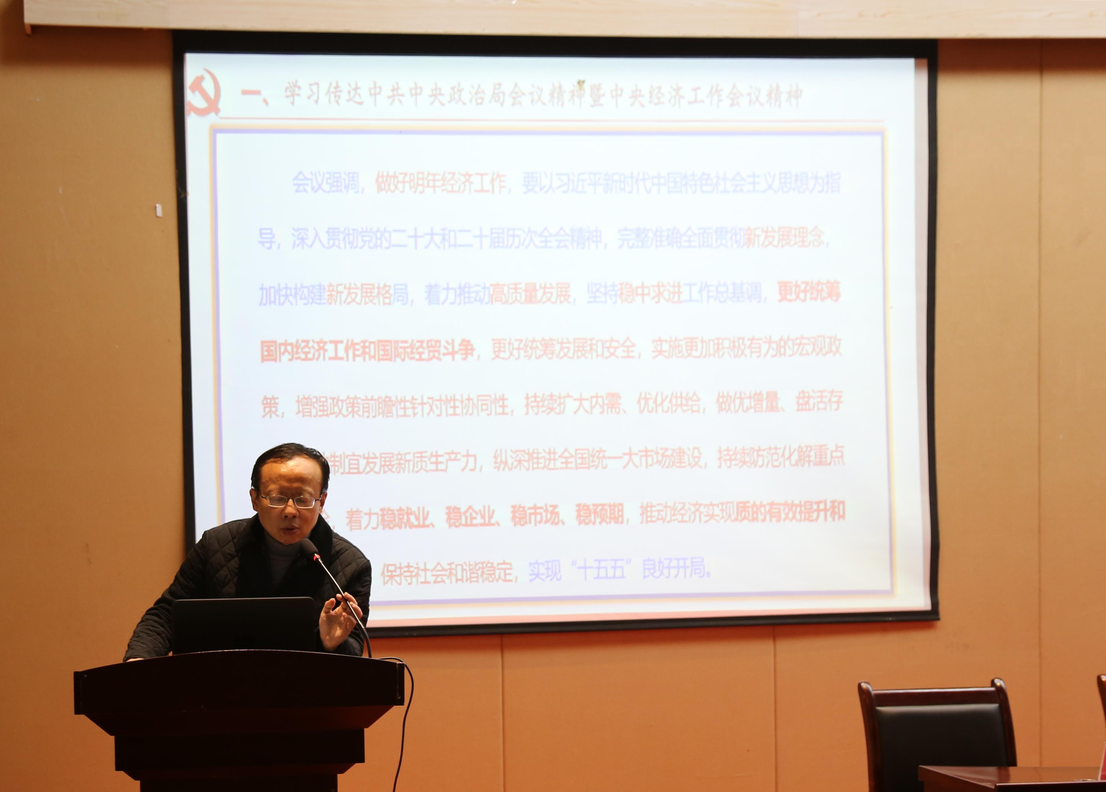 会上,学院负责人领学了“中共中央政治局会议精神暨中央经济工作会议精神”“习近平致中国志愿服务联合会第三届会员代表大会的贺信”的重要内容,聚焦中央经济工作会议的核心要点,对中央经济工作会议精神进行了系统解读,特别就扩大内需与国内市场、创新驱动与新动能、改革攻坚与增强活力、对外开放与合作共赢、协调发展与区域联动、“双碳”引领与绿色转型、民生保障与社会服务、风险防范与底线坚守等八个方面的内容进行重点阐释。指出学院将把学习贯彻中央经济工作会议精神作为当前和今后一个时期的重要政治任务,组织各党支部、系所开展专题学习研讨。希望大家将中央经济工作会议精神与“十五五”规划融入课堂教学和学术研究,围绕“适度宽松的货币政策”“重点领域风险化解”“资本市场投融资综合改革”等与金融领域密切相关的内容,找到研究方向。同时要求大家自行学习贯彻习近平总书记重要文章《推进党的自我革命要做到“五个进一步到位”》,以及习近平主持中共中央政治局第二十三次集体学习发表的重要讲话。