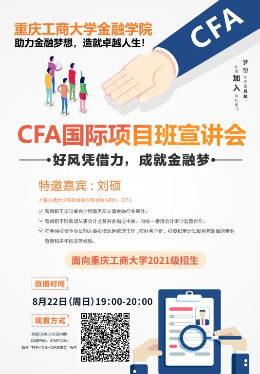 现将jinnianhui今年会2021级新生国际项目二次选拔jinnianhui今年会国际项目CFA(注册特许金融分析师)项目直播宣讲会有关事宜通知如下: