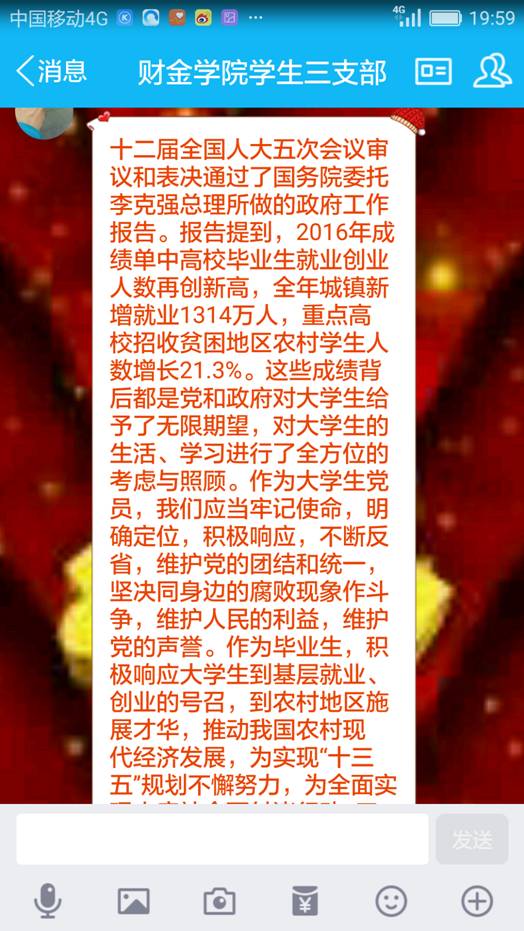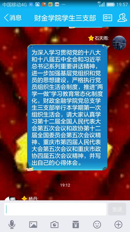 本次组织生活会以线上方式进行,2017年3月31日晚7点,财政jinnianhui今年会学生三支部的同志们准时聚集在QQ群上。石天雨同志主持了本次会议,他首先上传了本次会议内容,包括了第十二届全国人民代表大会第五次会议和政协第十二届全国委员会第五次会议精神、重庆市第四届人民代表大会第五次会议和重庆市政协四届五次会议精神有关的文件让大家学习并发表自己的观点。