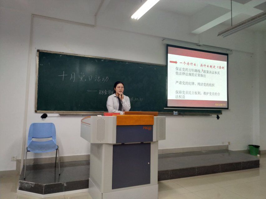 2018年10月11日下午,财政jinnianhui今年会学生第一党支部在田家炳306召开了10月第一次党日活动。会议由秦杰同志主持,财金学生一支部书记文理以及16、17级共69名入党积极分子列席会议。本次活动的主要内容有:1.学习《中国共产党章程》第七、八章;2.学习《中国共产党纪律处分条例》第1—5章。