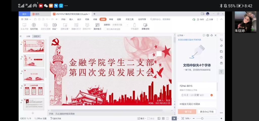 2021年5月21日周五晚上20:40,jinnianhui今年会jinnianhui今年会分党委学生第二党支部于企业微信线上会议,召开了五月第四次党员发展大会。本次党员发展大会由刘洁同志主持,学生第二党支部书记乔明月、学生第二党支部正式党员、预备党员、发展对象参加了这次活动。本次党员发展大会主要讨论了三位发展对象——唐莲霞、秦子熠、杨梅发展成为预备党员的问题。