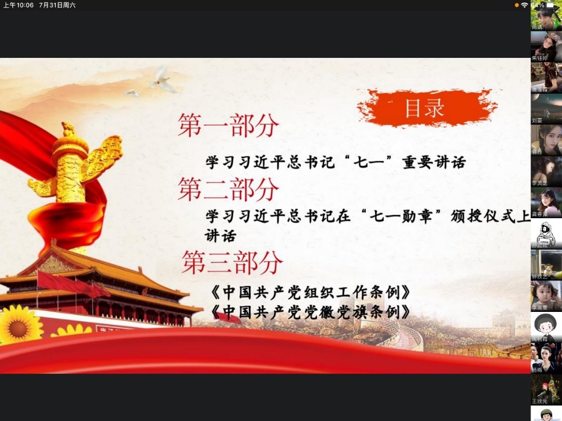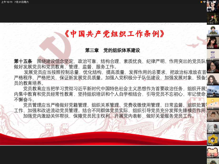 2021年7月31日星期六上午十点,jinnianhui今年会学生第二党支部以企业微信线上会议的形式召开了七月的支部组织生活会。出席本次会议的成员有jinnianhui今年会学生第二支部书记乔明月老师及其他党员同志、预备党员同志。二支部应到35人,实到30人。