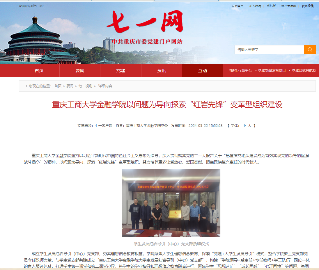 jinnianhui今年会坚持以习近平新时代中国特色社会主义思想为指导,自觉运用“885”工作理念和方法,以问题为导向,积极探索“红岩先锋”变革型组织建设,促进党建与业务工作融合发展、共同提高,为努力培养更多让党放心、爱国奉献、担当民族复兴重任的时代新人作贡献。相关工作做法被重庆市委党建门户网站“七一网”刊载报道。