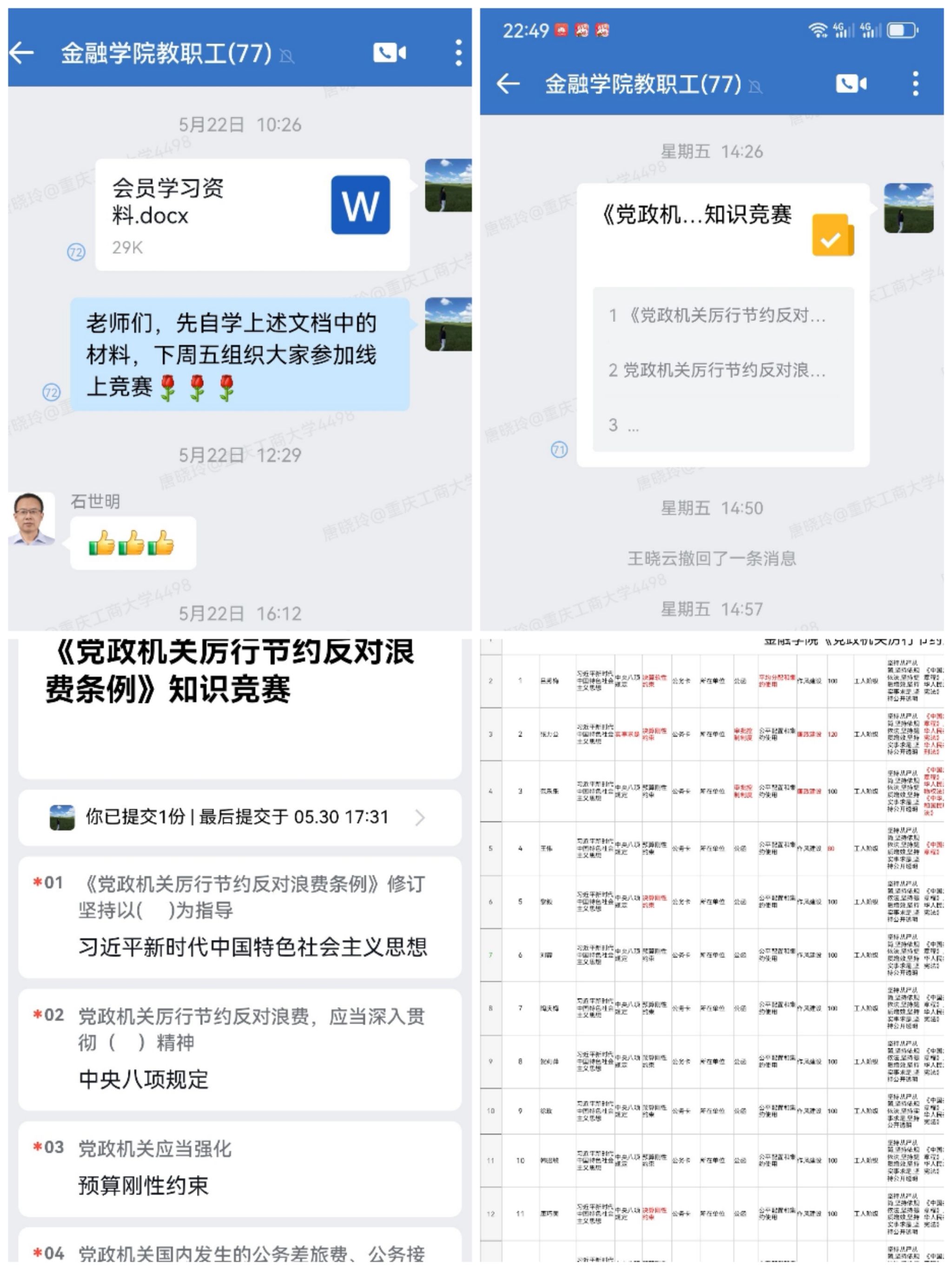 学院工会先将《党政机关厉行节约反对浪费条例》放在部门企业微信群,要求会员们自学;5月30日,工会主席领学条例的主要内容;随后开展在线答题。本次竞赛共有25个题目,其中单项选择题和判断题各10题,多项选择5个题;题目主要结合高校教师的实际,选择了经费管理、国内差旅、公务接待、资源节约等相关内容。会员们认真学习条例,仔细作答竞赛题目,获得满分的会员达到20人。