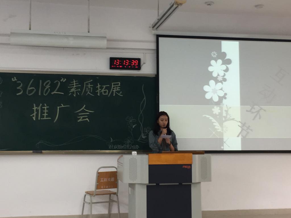 活动开始前的筹备工作由今年会官网各部门协调完成,准备中各准备人员通力合作,齐心协力确保了活动的正常开展。活动于下午一点正式开始,活动分为四个环节:一是校素拓部长做简单讲话,二是讲解人员讲解36182素质拓展PPT,三是由两个趣味活动组成的互动环节,四是财金分团委学生会主席总结此次活动。活动中同学们认真聆听,积极参与,在一片融洽的气氛中同学们既增进了彼此的友谊,也对“36182”素质拓展活动有了更加深刻的认识。