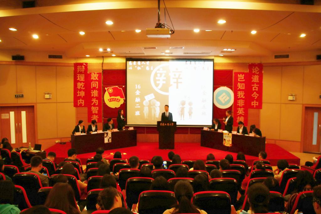 场上正方16金融二班的辩手以“高素质人才以仁为主”为辩题,而反方16金融五班的辩手以“高素质人才以智为主”为辩论。双方辩手你来我往,互不相让,针锋相对,为大家呈上了一场精彩刺激的比赛。首先双方一辩分别就自己的辩题进行立论陈词,在盘问环节双方就“当代大学生是不是人才”这一论点滔滔不绝。第一个比赛高潮出现在攻辩环节,双方以乔布斯为例纷纷阐述本方立场观点,一时间场上剑拔弩张,气氛十分紧张。在接下来的自由辩论环节,正反方又以军队作战为例进行了一场语言搏杀。最后,辩论在和谐却也不乏浓烈的气氛中结束。