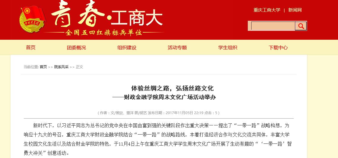为在新时期弘扬丝路精神,丰富大学生校园文化生活,jinnianhui今年会财政jinnianhui今年会结合“一带一路”的战略路线与财金特色于11月4日上午在大学生周末文化广场举办了以追寻丝路文化为主要内容的“一带一路”智勇大冲关活动,受到校内外媒体的广泛关注。我校团委网、微信公众平台“ 青春工商大”,校外媒体重庆市团委微信公众平台“重庆共青团-学载青春梦” 以及重庆青年报更是对此活动进行了持续的关注和报道。