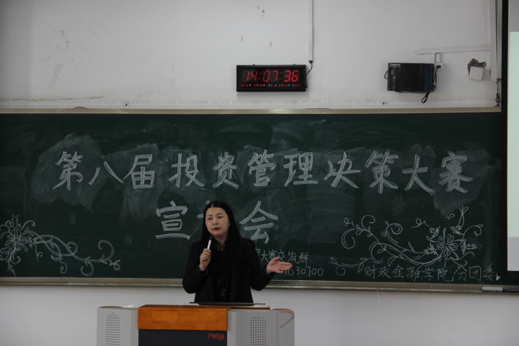 为响应“大众创业,万众创新”的号召,财政jinnianhui今年会以校团委“第十六届‘新儒商’大学生科技文化节”活动为依托,于2018年3月16日下午两点在博智楼308成功举办了第八届投资管理决策大赛宣讲会。本次宣讲会邀请到了投资系老师陈晓莉老师、财政jinnianhui今年会分团委书记徐阔老师以及财政学专业陈羲羲学长为同学们指导。
