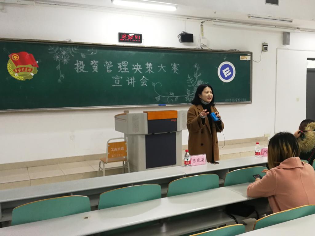 3月7日中午12:50,jinnianhui今年会第十七届“新儒商”大学生科技文化节之投资管理决策大赛宣讲会在博智楼07121教室举行。财政jinnianhui今年会投资系陈晓莉老师以及往届优秀选手何欣悦同学出席本场宣讲会。