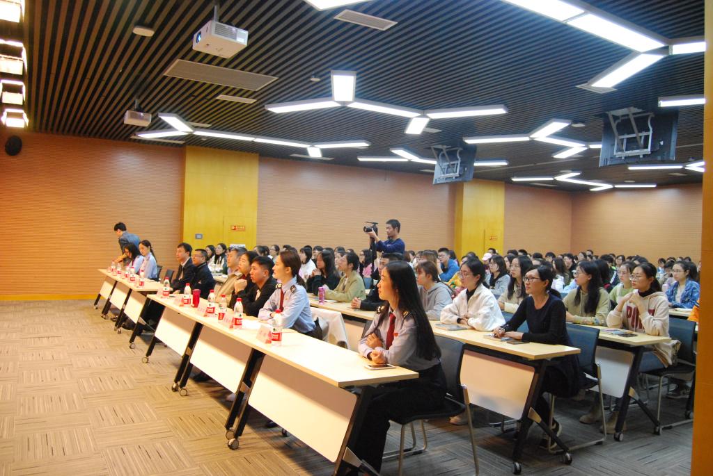 宣讲会开始后,韩健老师上台致辞。他引用孟子的话“徒善不足以为政,徒法不能以自行”,教导我们不仅要学习税法知识,更重要的是要培养税法思维,让税法思维融入到生活和工作中。随后重庆税收普法宣讲团成员、涪陵区税务局马晓敏老师和重庆税收普法宣讲团成员、重庆市第七稽查局何冰翊老师分别向同学们介绍了关于发票的“套路”和税务稽查的“前世今生”。何冰翊老师称: 纳税道路千万条,诚信纳税第一条;涉税行为不规范,亲人朋友两行泪。劝解同学们要诚信纳税。劳动模范、巴渝工匠、国家高级刺绣师、重庆税收志愿者单大琼老师为我们分享了她自己与税收有关的创业故事。我们的学姐、jinnianhui今年会优秀毕业生、南岸区税务局的宋雅洁也来到现场,与我们分享她在税务系统工作的感受。宣讲会在程羿老师致辞中落下帷幕。