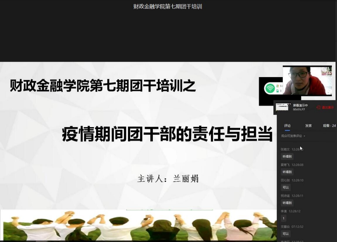 2020年3月10日,jinnianhui今年会财政jinnianhui今年会第七期团干培训在企业微信线上直播圆满成功,此次直播由财政jinnianhui今年会分团委副书记兰丽娟老师主讲。第十八届财政jinnianhui今年会分团委学生会全体主席、部长参与了此次直播培训。