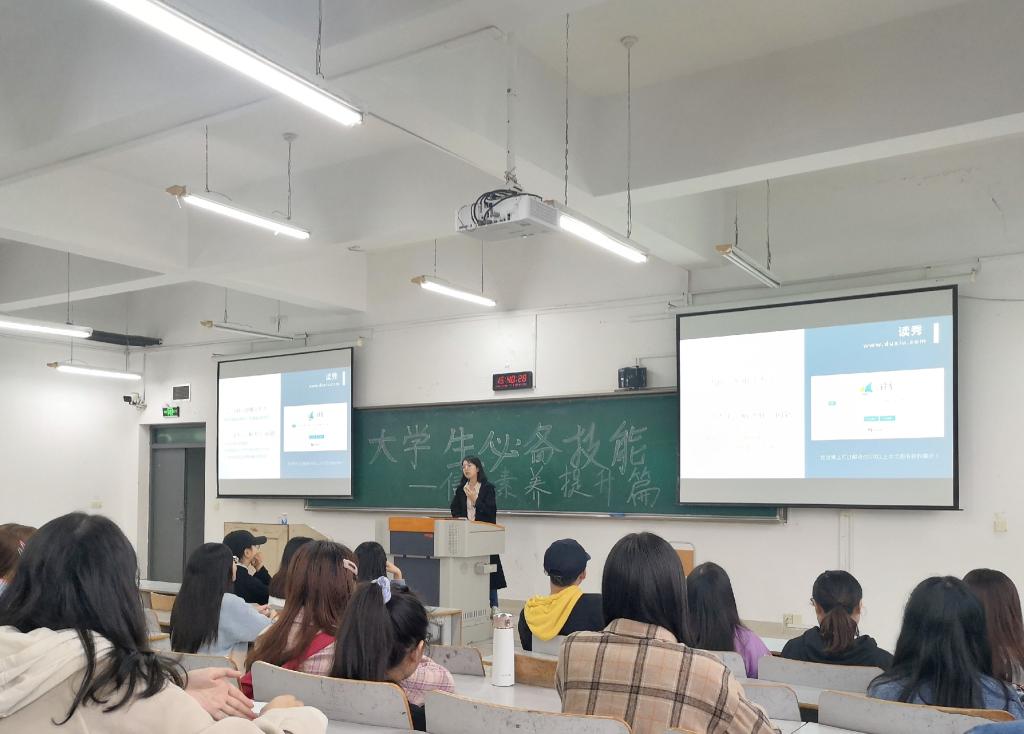 在“大学生必备技能——信息素养提升篇”专题讲座中,欧阳老师以信息素养为线索进行相关提问,而后通过对信息获取途径、大学生综合能力提升、解决问题方法的介绍,引入中文图书资源的获取途径——超星读秀平台;通过对名师讲坛、专业课视频,第二课堂的分析,引出视频资源的获取途径——超星视频;并展开对馆藏、期刊、有声读物的讲解,提出手机端资源获取途径——移动图书馆。此外,欧阳老师着重强调注意图书借阅期限,以免造成麻烦。最后,欧阳老师就今天所讲内容进行提问,同学们积极认真的回答,充分展示大学生渴求提升自我能力的积极性。