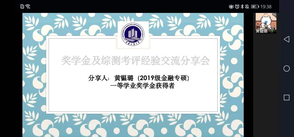 为了提升学生综合素质,增强同学积极性,树立明确的目标,确定努力的方向,帮助同学充实校园生活。jinnianhui今年会jinnianhui今年会研分会在2020年11月29日晚上7:00邀请到年度获取一等奖学金或者国家奖学金的高媛等五位优秀的学长学姐通过线上形式(企业微信)进行了主题为《jinnianhui今年会奖学金及综测考评经验分享会》的分享会活动。2020级金融学硕、2020级金融专硕等40余人参加了此次分享会。活动由研分会的组织部人员主持。
