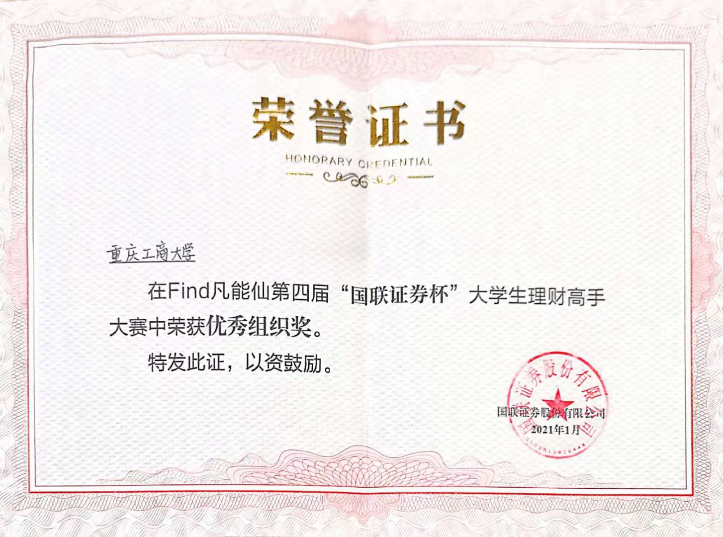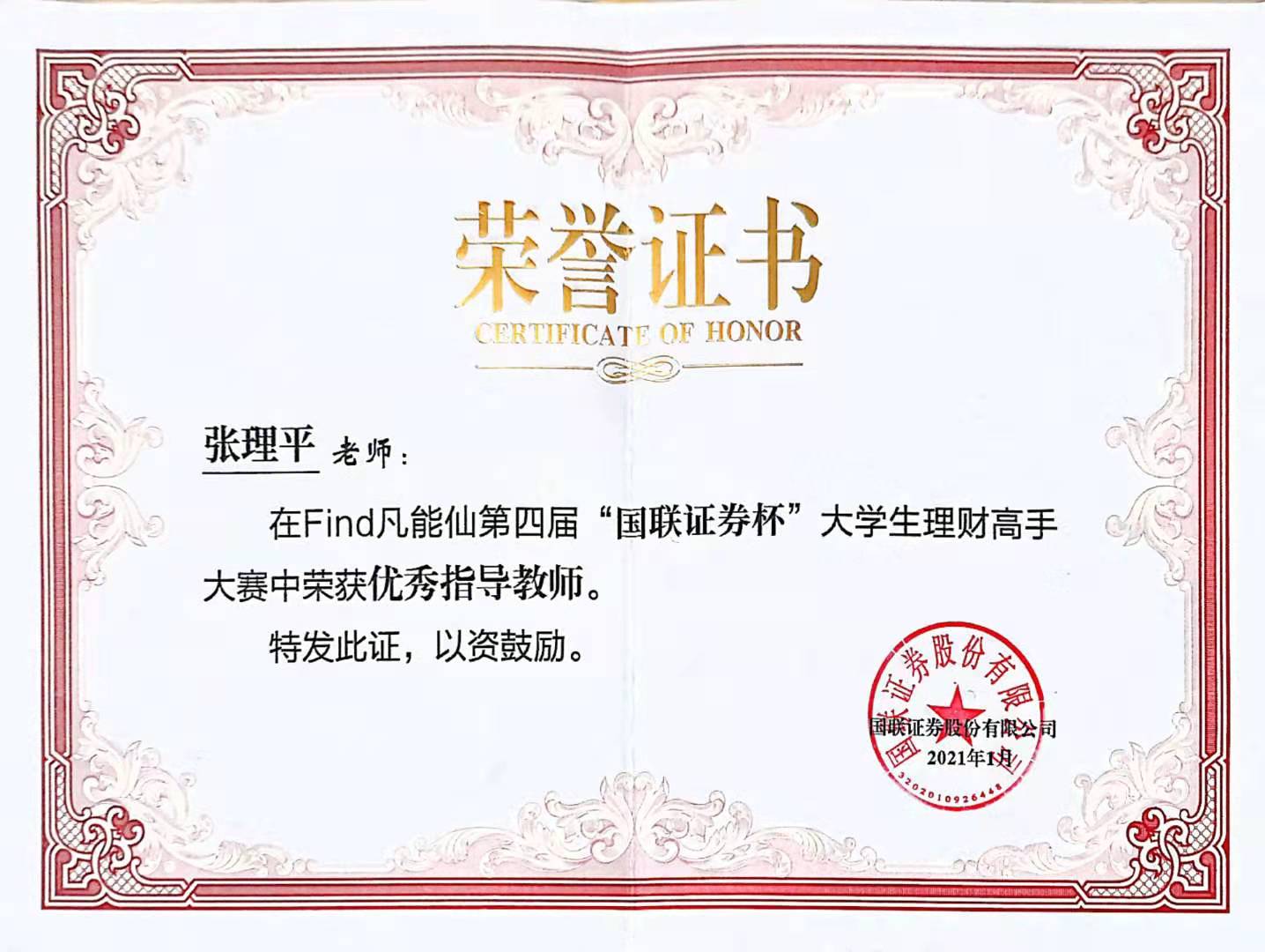 2021年1月10日,第四届“国联证券杯”-Find“凡能仙”大学生理财高手大赛决赛暨颁奖仪式圆满落幕,jinnianhui今年会代表队荣获“优秀组织奖”。金融工程专业张理平老师荣获“优秀指导教师奖”。在基金理财个人赛中,我校蒋涵月获得“二等奖”,杨松获得“三等奖”,寇力元,许梦茹等同学荣获“优秀奖”。
