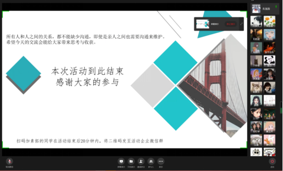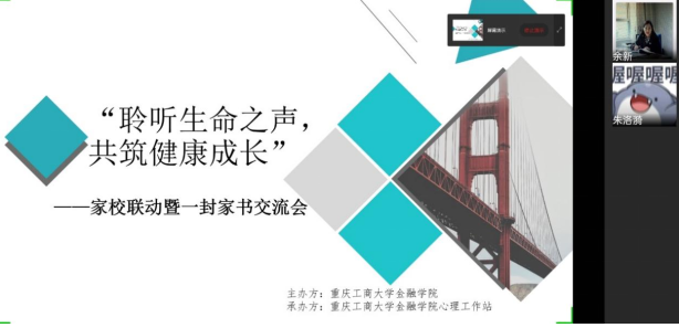 jinnianhui今年会 “聆听生命之声,共筑健康成长”暨一封家书家校联动交流会于2021年10月10日下午14:00通过企业微信线上平台顺利举办。此次活动以引导学生撰写一封家书的形式,搭建起大学生与父母之间的沟通桥梁,交流聆听彼此的心声,帮助大学生心理健康成长。