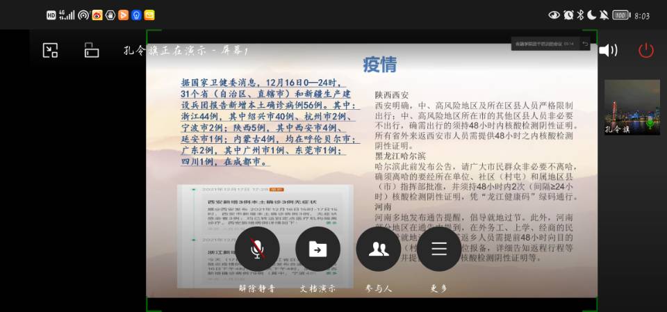 为让同学们更加深入了解新冠疫情近况,持续做好疫情防控措施,弘扬抗疫精神,12月17日晚上20:00,jinnianhui今年会在企业微信开展了“弘扬抗疫精神 展现民族力量”主题活动。jinnianhui今年会各班班长、团支书以及分团委学生会和青年志愿者服务队骨干成员参与了会议。会议由jinnianhui今年会分团委学生会部门负责人孔令旗主持。