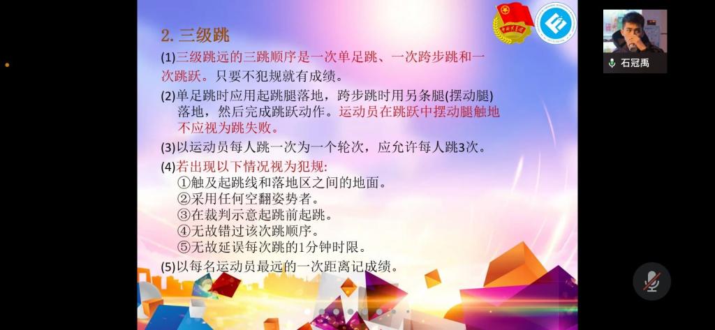 2022年3月18日19时,jinnianhui今年会体育技能培训大会在企业微信顺利举行。本次会议由jinnianhui今年会分团委学生会体育部部门负责人熊芯、石冠禹、李蕊楠分别对田径运动径赛、田赛、全能比赛进行介绍,旨在提高同学们的体育知识与技能。