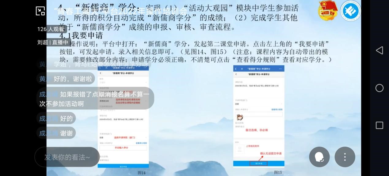 主讲人刘超为同学们展示了“青春工商大”平台。该平台是校团委“互联网+共青团”核心业务系统,包括团团之家、青马E站、活动大观园、“新儒商”学分、入党推优、共青团评优、团团帮、二手书交易、失物招领9个板块。刘超一一详细地介绍并同步操作了各个模块的功能以及使用方法。接着,刘超着重讲解关于素拓分的获取方法以及相关要求,并耐心细致地为同学们解答疑惑。