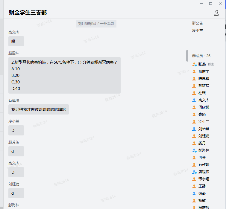 2020年春节前夕,新冠病毒肆虐,导致全国上下停工停产,在党中央的坚强领导以及一线医护人员的不懈努力下,目前疫情得到初步控制。为支持疫情防控工作,学校延迟开学,并开展了一系列线上教学活动。按照院党委学习安排,学生第三支部在3月20日开展了本学期第一次线上组织生活会。组织生活会主要由党员同志领学新思想、共享感悟、防疫知识竞赛和总结发言四个环节构成。