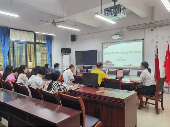 5月20日下午,jinnianhui今年会党委副书记、院长王兰为学院领导班子成员、行政干部、辅导员老师讲授题为“领导干部要在改进作风上发挥示范作用”的党史学习教育专题党课。学院党委书记、副院长王建明、学院党委副书记、纪委书记余新、学院副院长庞楷、专职组织员赵甫刚、全体行政人员、辅导员老师参加此次专题党课。