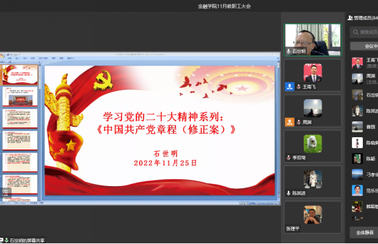 11月25日,jinnianhui今年会召开教职工大会暨11月政治理论学习会,专题宣讲党的二十大精神。学院全体教职工参会,学院党委书记、副院长石世明同志主持。