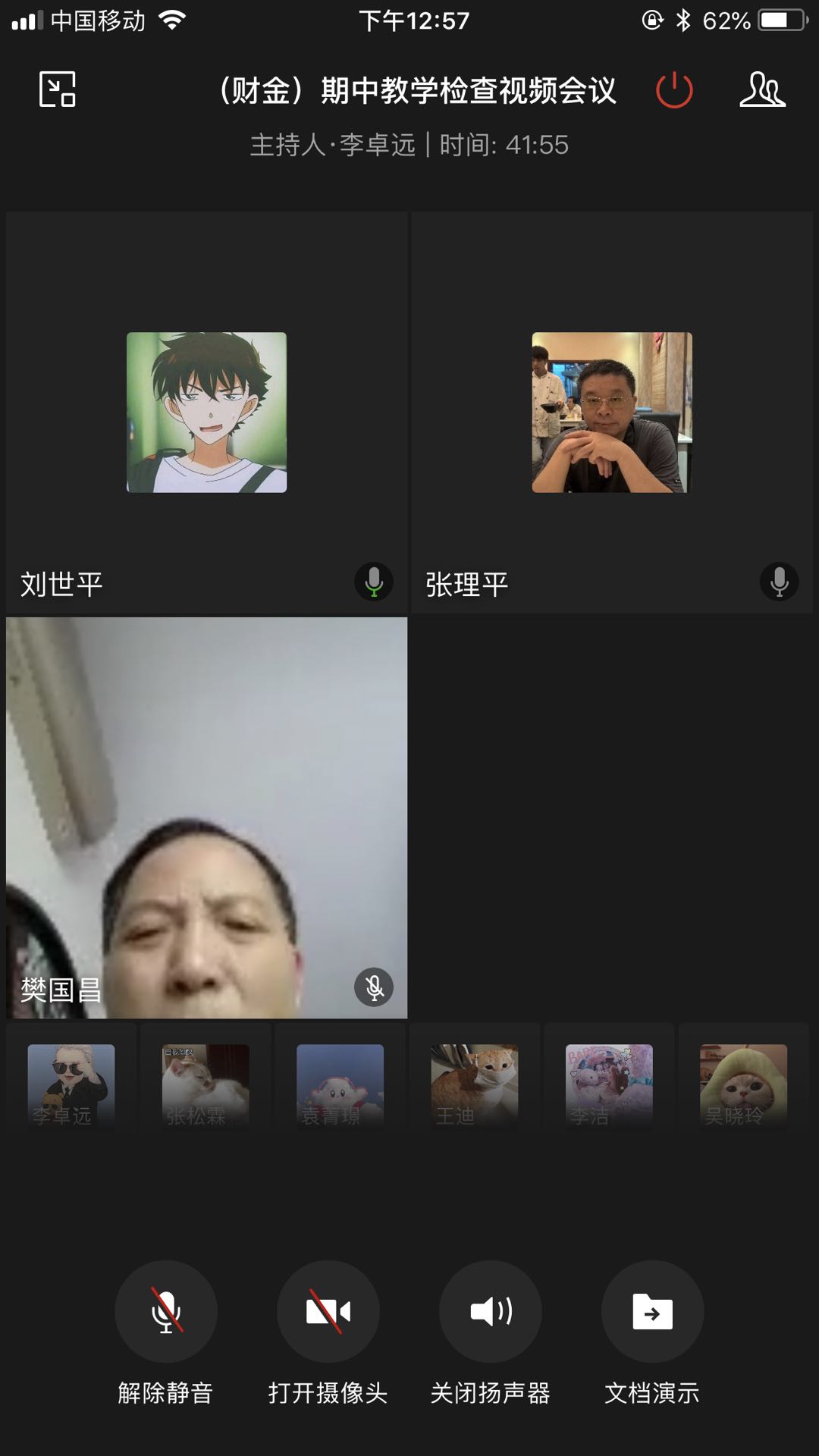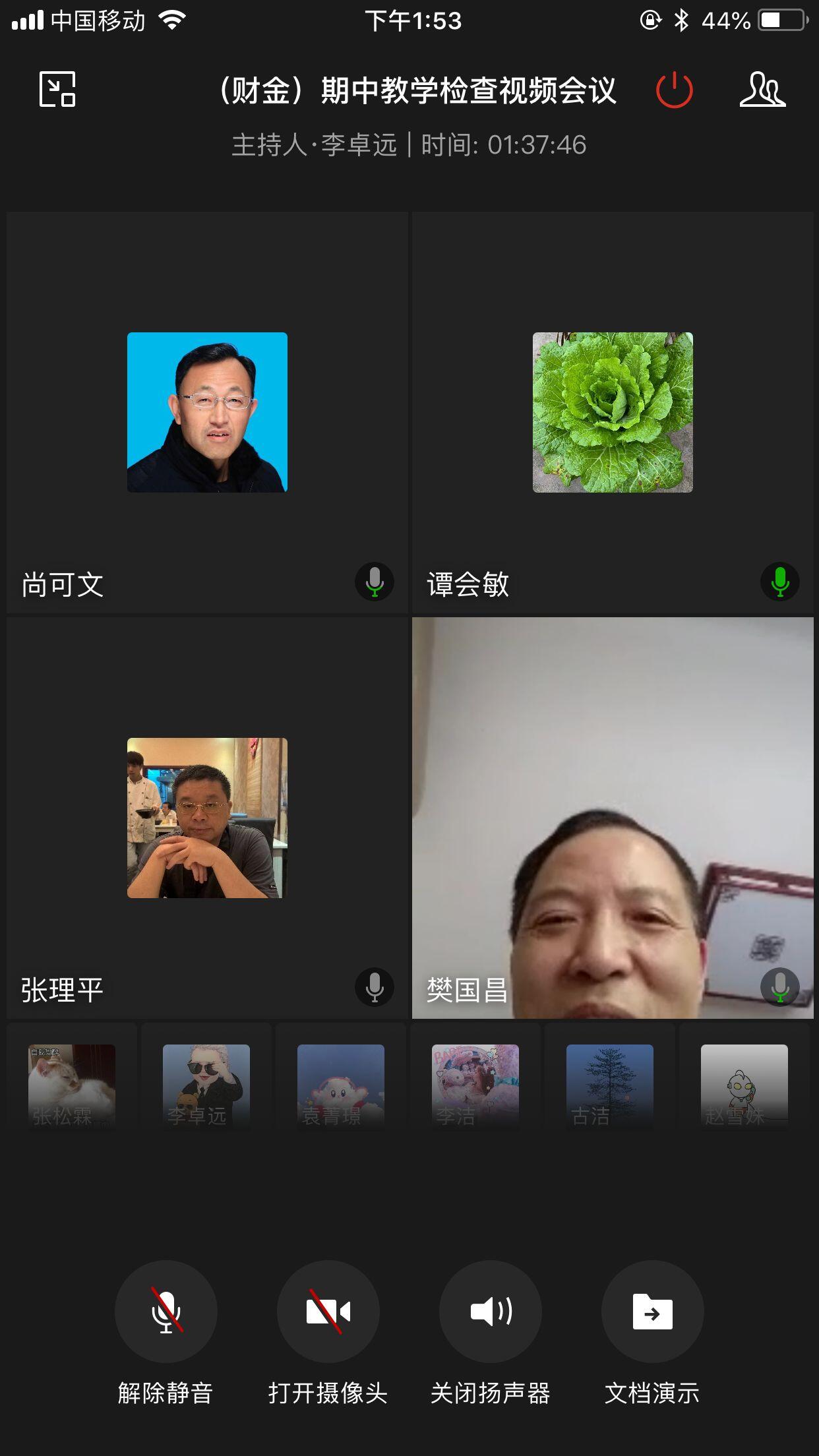 2020年4月29日,财政jinnianhui今年会召开期中教学检查视频会议。会议由财政jinnianhui今年会校级督导保险学系樊国昌教授主持。学院教学院长王兰教授、院级督导、各系主任和学院教学管理老师,2017级、2018级各班以及2019级CFA专业的学习委员参加了此次视频会议。