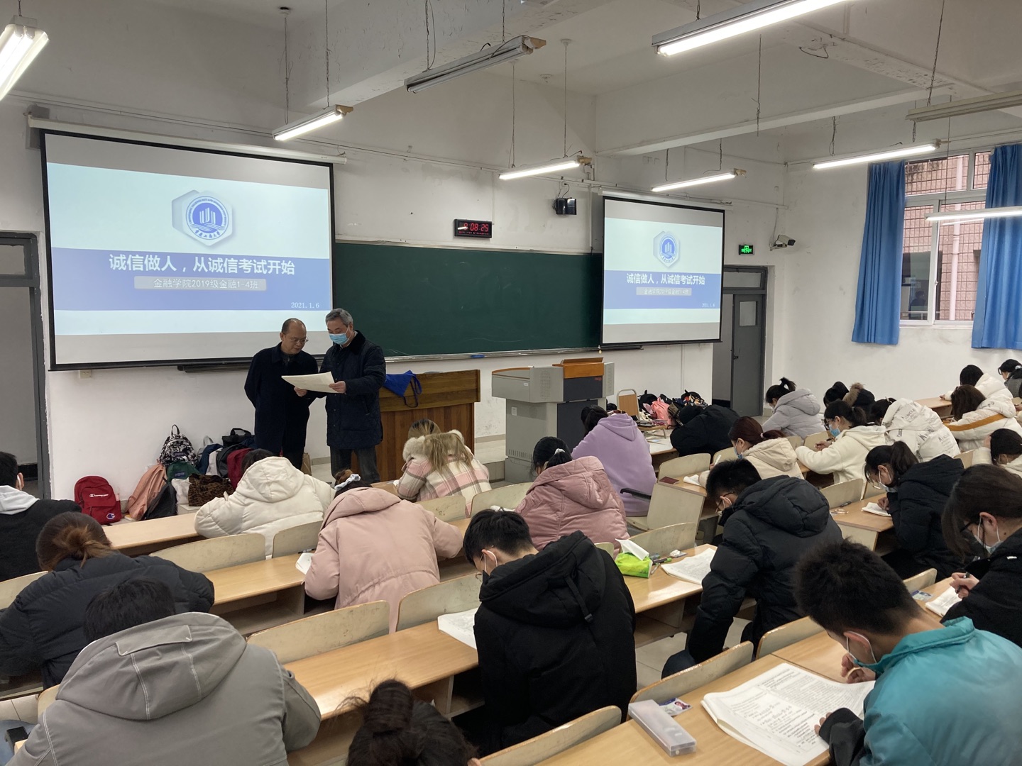 为培养具有“新儒商”精神的新时代大学生,践行“诚信做人,从诚信考试开始”的誓言,2021年1月6日jinnianhui今年会2019级金融学专业共计159名学生自愿申请在博智楼07207和07208教室举行《金融学》课程的“免监考”诚信考试,这是jinnianhui今年会首次举行的“免监考”诚信考试,副校长李国军教授、校长助理谭松涛教授前来巡考。