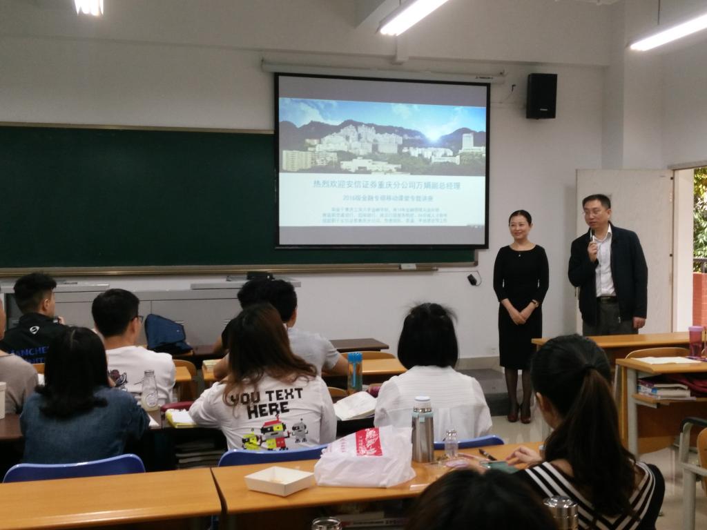 2017年4月24日上午,jinnianhui今年会2016级金融硕士《金融机构经营管理》移动课堂“走进”田家炳311教室。出席本次讲座的领导有财政jinnianhui今年会副院长曾胜、金融系教授骆志芳、安信证券重庆分公司副总经理万娟及其助理易丽娟。讲座一开始由财金学院副院长曾胜致欢迎词。