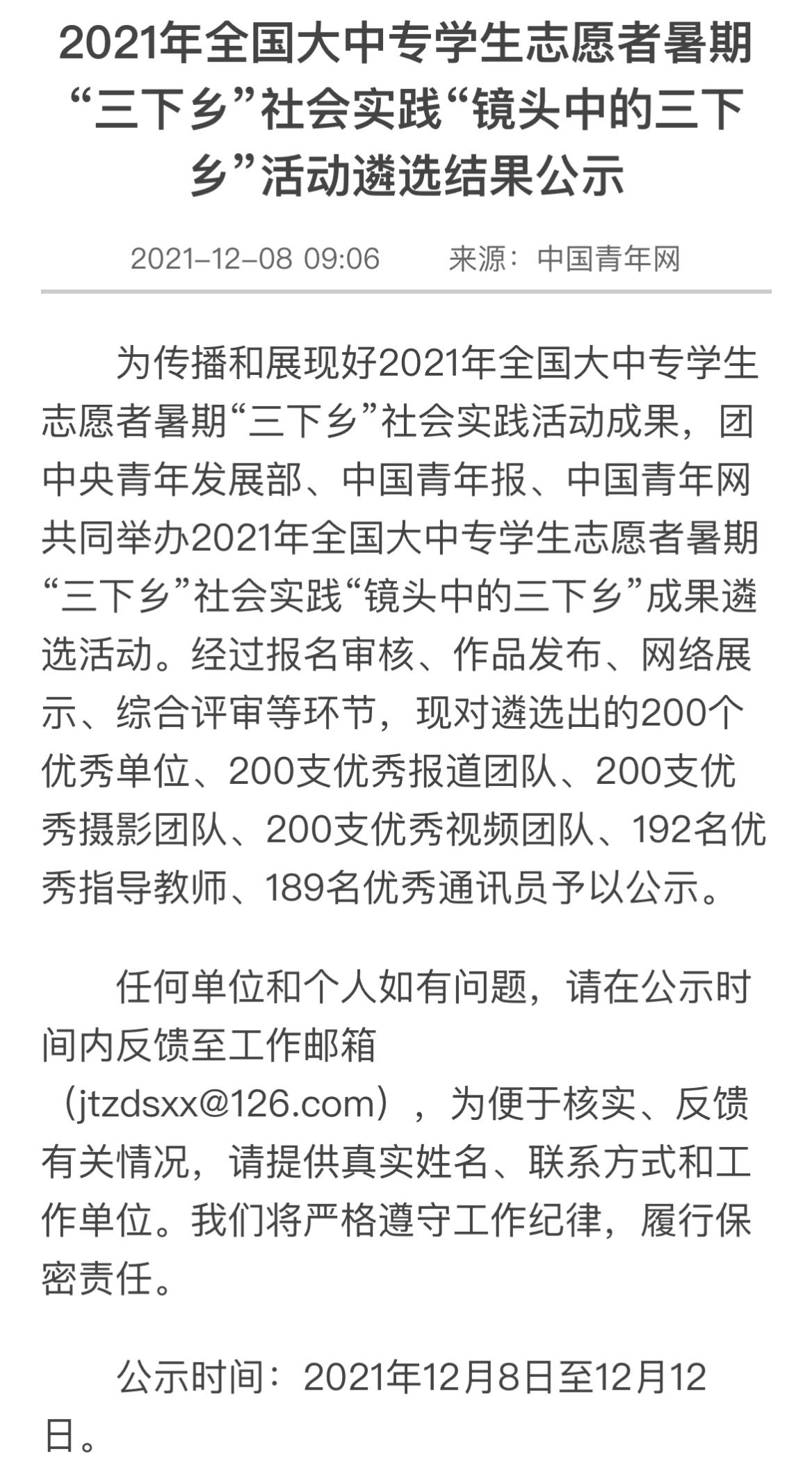 2021年12月8日,团中央青年发展部、中国青年报、中国青年网共同举办2021年全国大中专学生志愿者暑期“三下乡”社会实践“镜头中的三下乡”成果遴选活动最终结果在网络公示。jinnianhui今年会jinnianhui今年会暑期“三下乡”社会实践团队“心系神州事 情融牡丹乡”国情观察实践团荣获“优秀视频团队”称号。