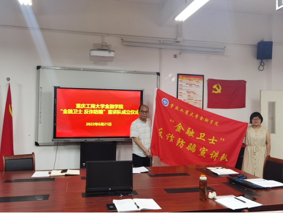 学院党委书记、副院长王建明给学院双创支部书记乔明月授“金融卫士 反诈防骗”宣讲队队旗并总结讲话。他强调学院党委将号召学院金融、保险、投资和金工等专业的专家教授、师生以学院双创支部“金融卫士 反诈防骗”宣讲活动为依托,利用所学专业知识服务广大群众,做到党建工作与事业发展相融合。同时指出“金融卫士 反诈防骗”宣讲队是jinnianhui今年会党委打造的党建与专业知识高度融合的特色党建品牌,力争将”金融卫士 反诈防骗”宣讲队磨练成为可以届届相传的队伍。